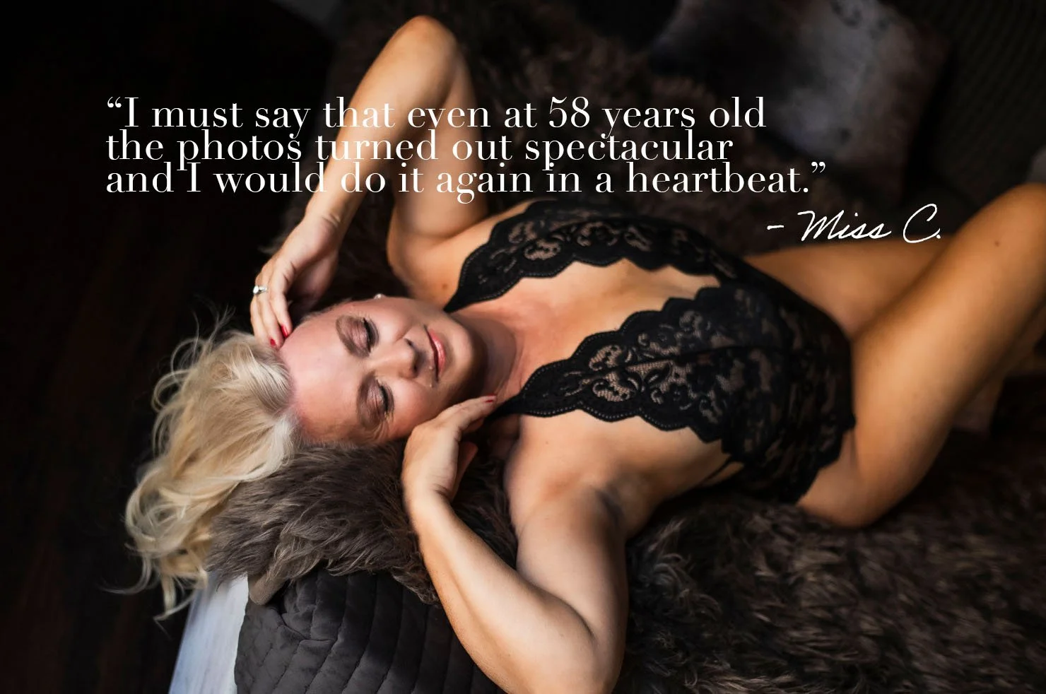 I was afraid that I would not look very attractive, especially as a woman my age putting myself out there to be photographed. I must say that even at 58 years old the photos turned out spectacular and I would do it again in a heartbeat.